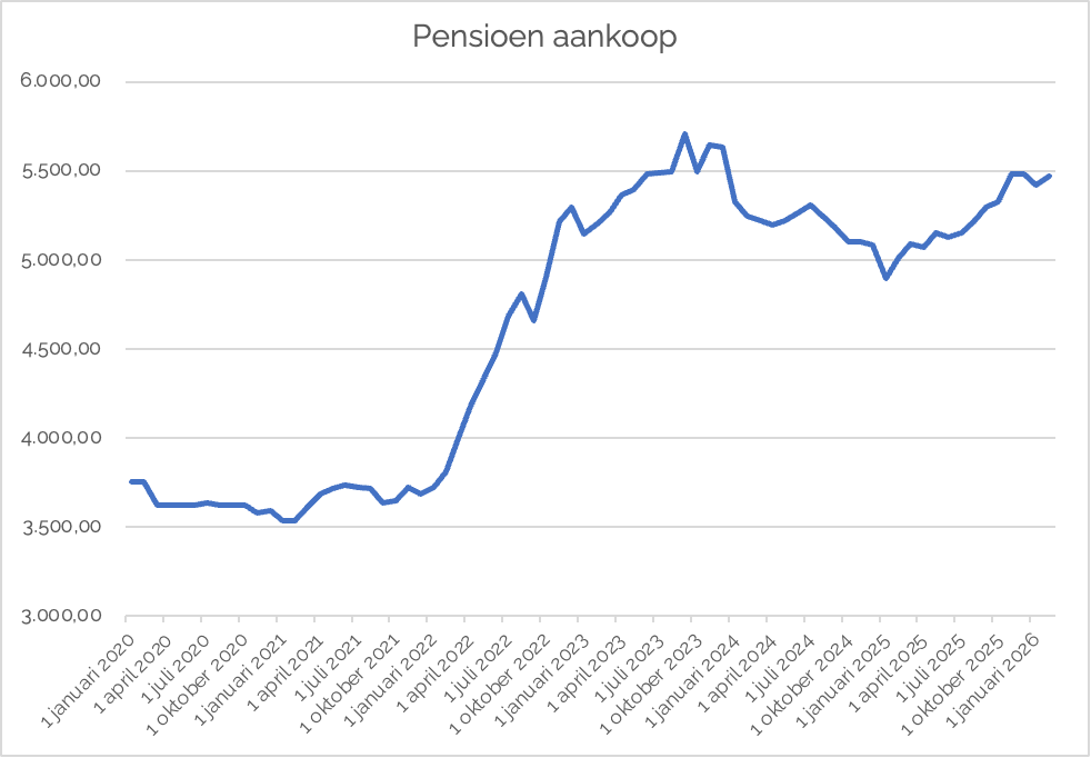 Als gevolg van een oplopende rente, is het aankooptarief de afgelopen drie jaar steeds gunstiger geworden. Pensioen aankopen was lange tijd niet zo voordelig als nu. We zien na een lichte daling weer een iets oplopende lijn. We zitten weer op het niveau van ongeveer twee jaar geleden.